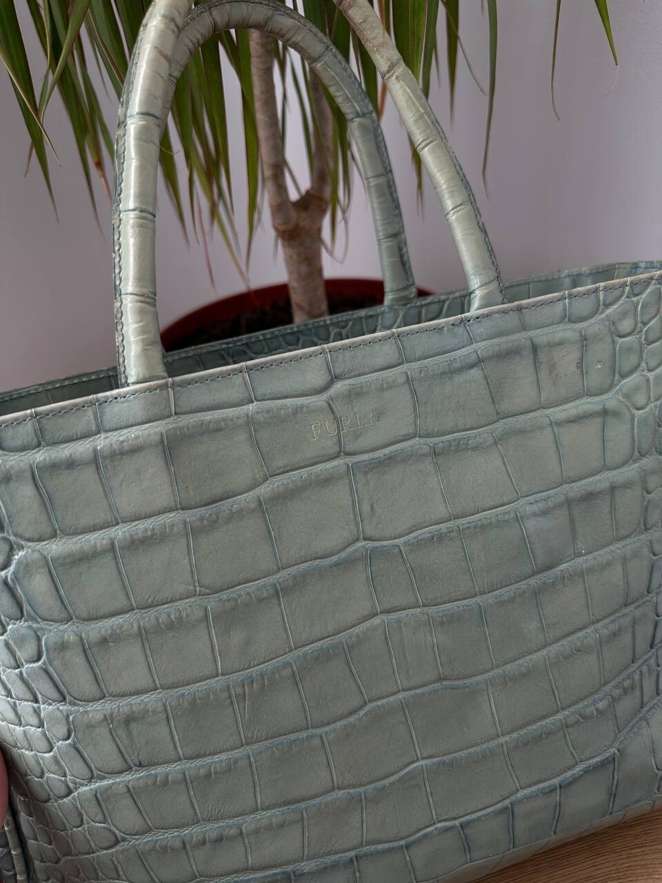 VTG Furla Faded Crocodile Embossed Leather Tote Bag Mint Green