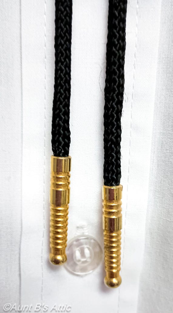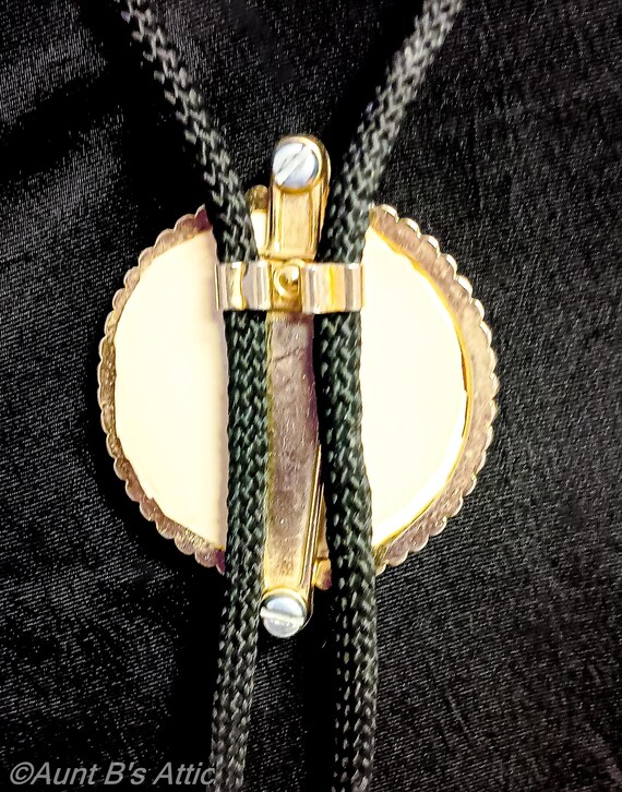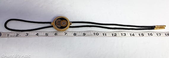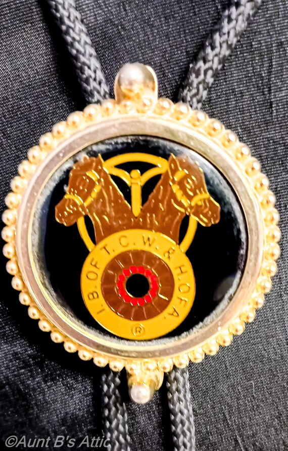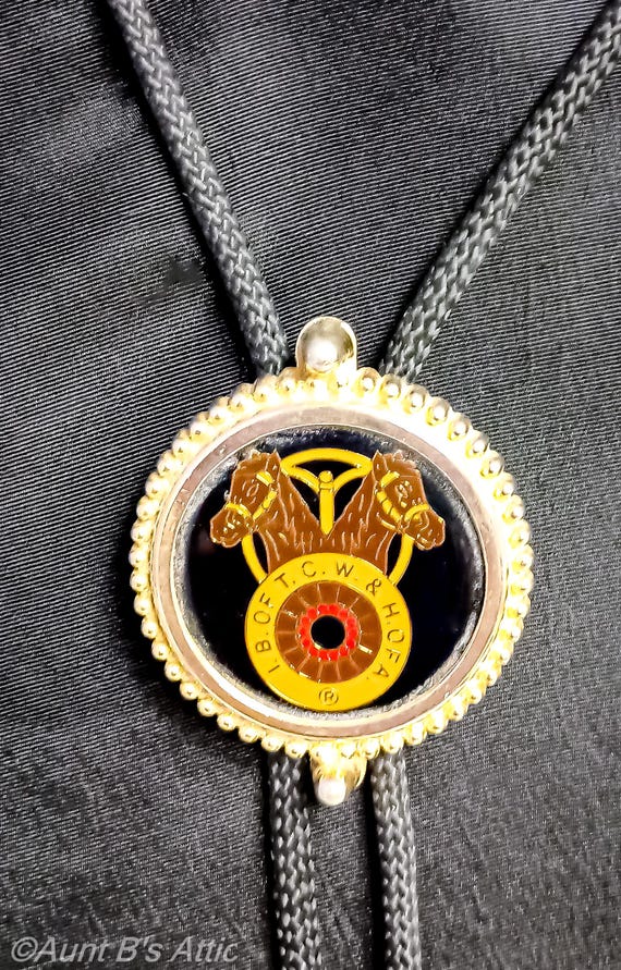 Vintage Teamsters Union Emblem Bolo Tie 1.75″ Gold Metal Frame Black Cord With Gold Tone Aglets Union Workers Tie