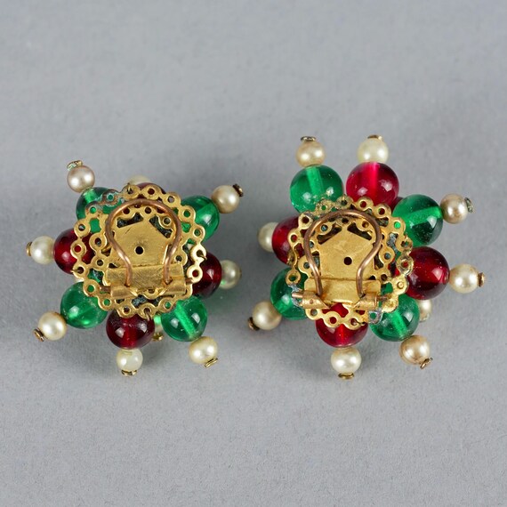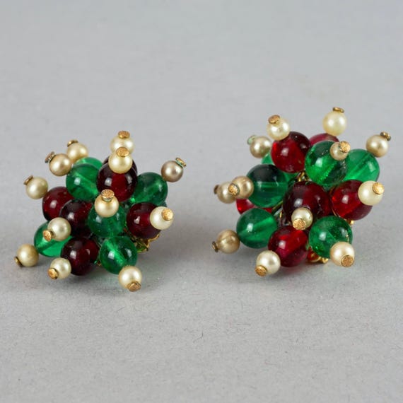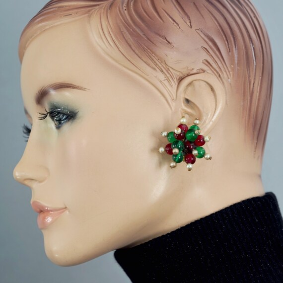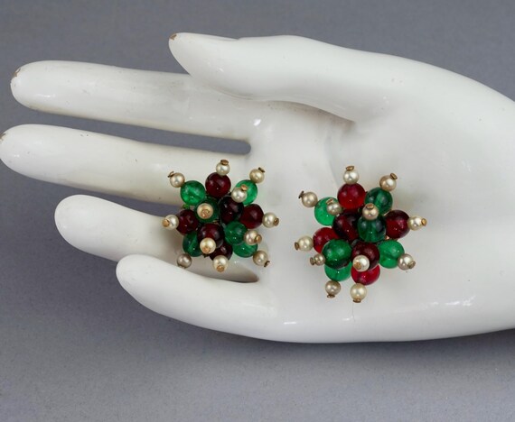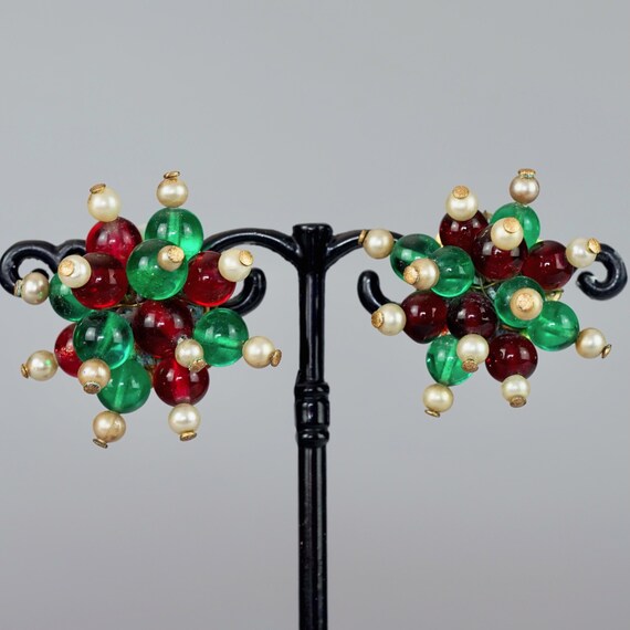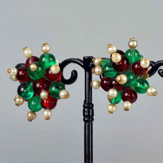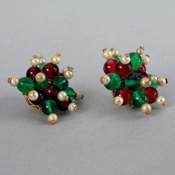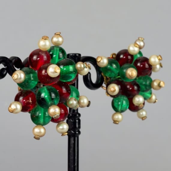 Vintage LOUIS ROUSSELET French Red and Green Gripoix Pearl Cluster Earrings