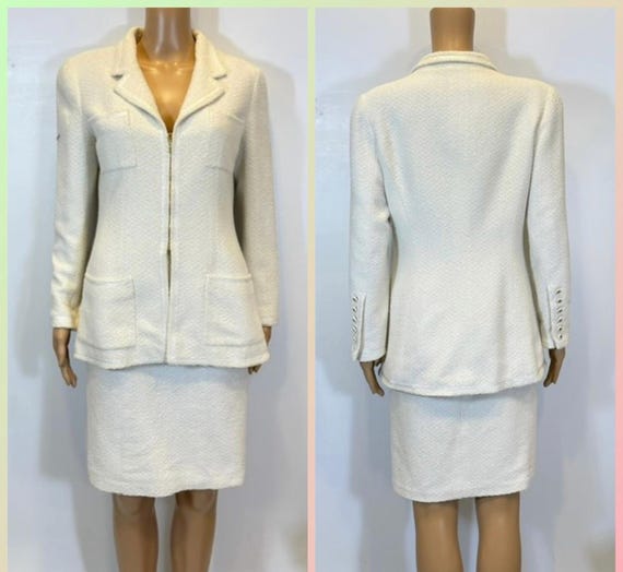 Vintage Chanel 95P Barbie Runway Ivory Patent Trim Skirt Suit FR 42 US 4/6